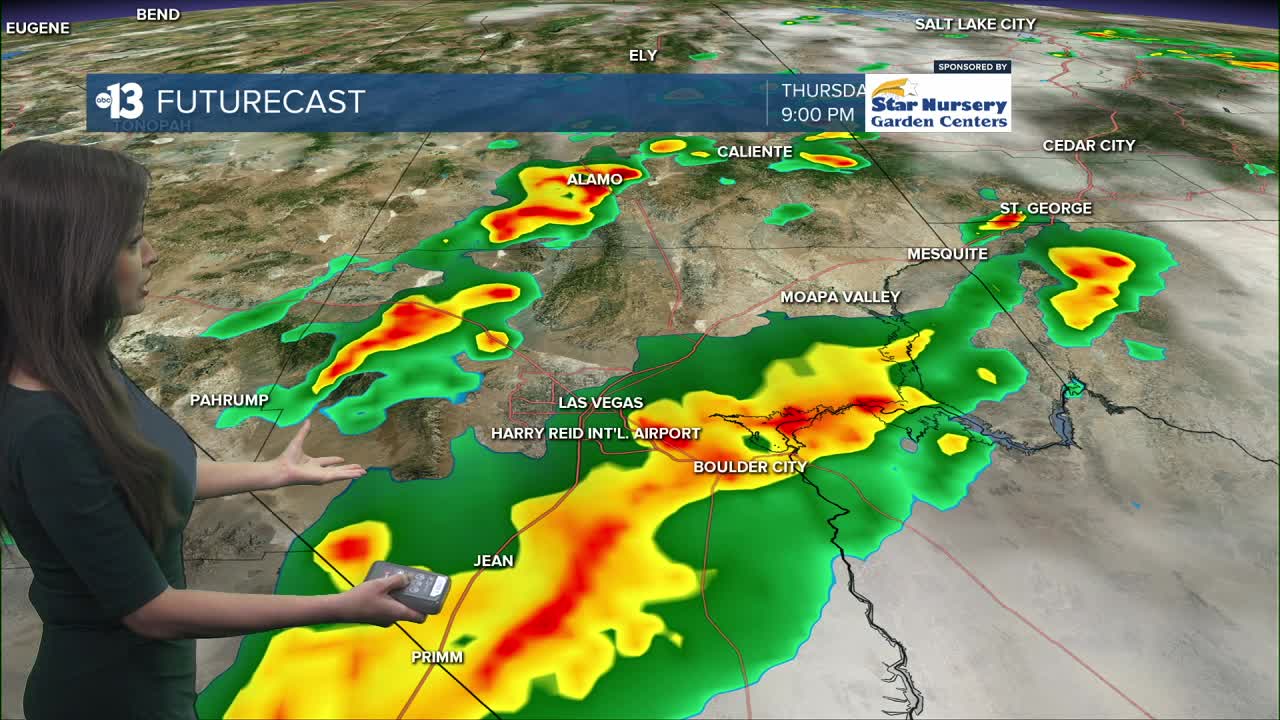Mostly cloudy with a chance of showers tonight. Lows in upper 60s. Scattered showers and storms on Friday as moisture from Tropical Storm Priscilla continues to move into Southern Nevada. Chance of showers and storms on Saturday, then we dry out by Sunday. Highs in the 80s through Saturday. Dry and cooler by Sunday with highs in the 70s and the 70s will stick around next week. Overnight lows will drop into the 50s and 60s.
