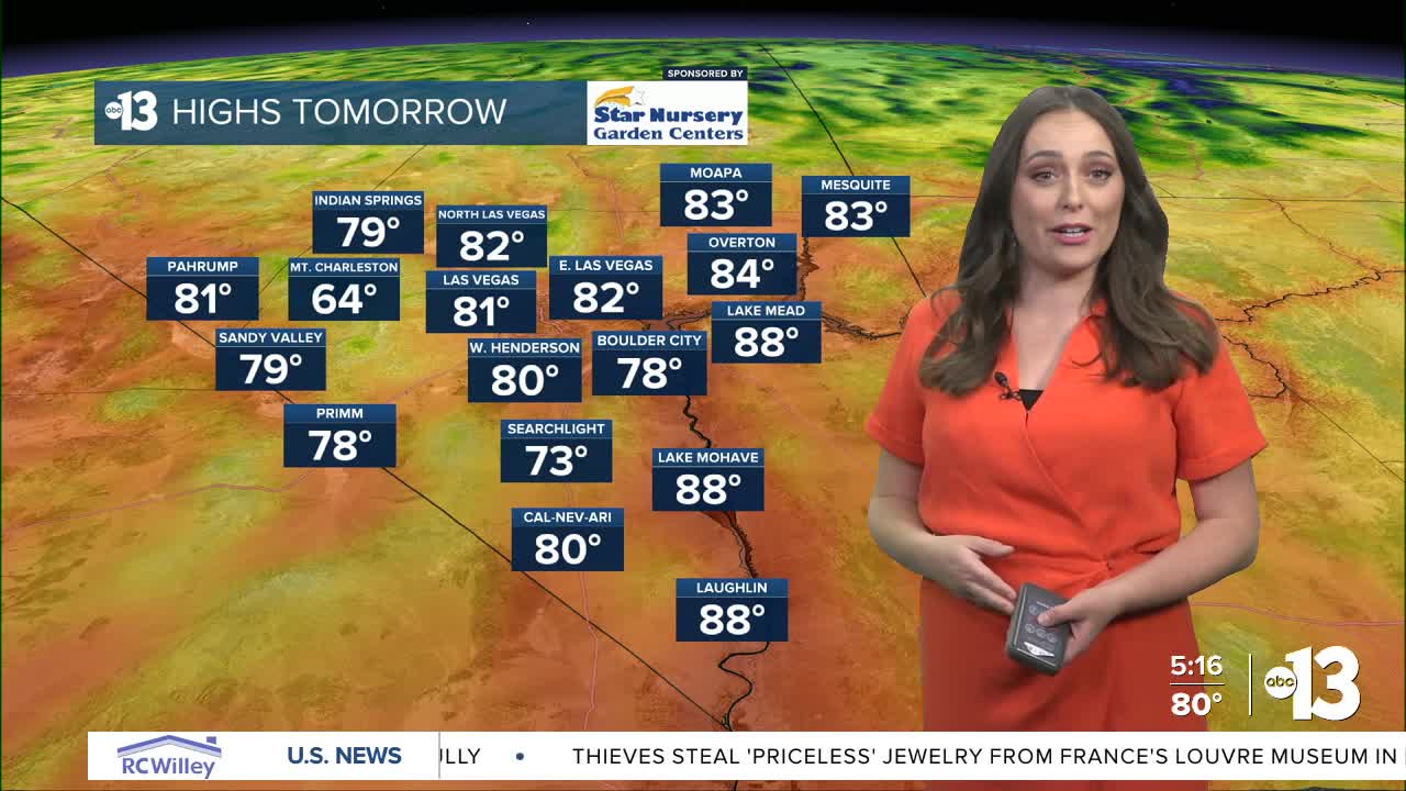 Sunny skies will hang out in Southern Nevada Monday and Tuesday. Overnight Tuesday into Wednesday morning a weak low-pressure system migrates into Nevada - but we won't see too much of an impact locally beyond some cloud cover and a slight dip in temperatures, with slightly stronger breezes. Ultimately, it will not disrupt the mild nature of the week ahead.