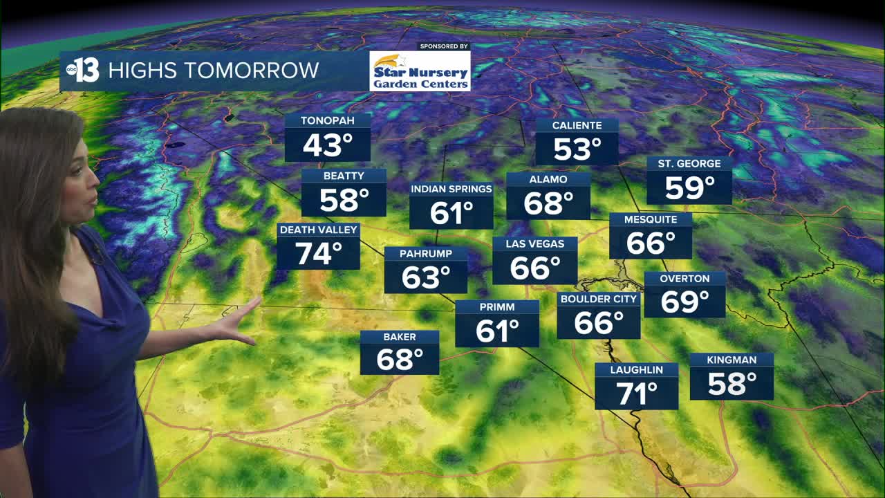 Mostly clear and breezy tonight with lows in the 50s. A strong area of low pressure will be moving into the region Thursday, bringing cooler air and gusty winds to Southern Nevada. Highs will reach into the upper 60s which is close to normal for this time of year. We’ll be windy and cool again on Friday. Temperatures will be warming back up into the 70s starting on Saturday and remaining windy. Winds lighten by Sunday. Warm and dry weather next week with highs in the upper 70s.